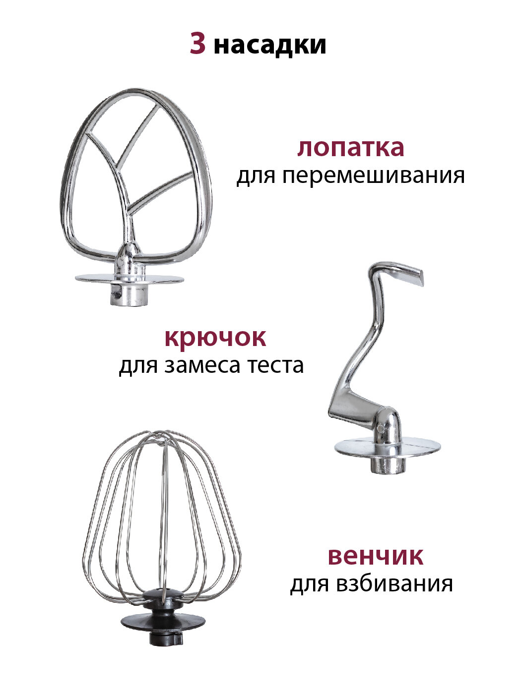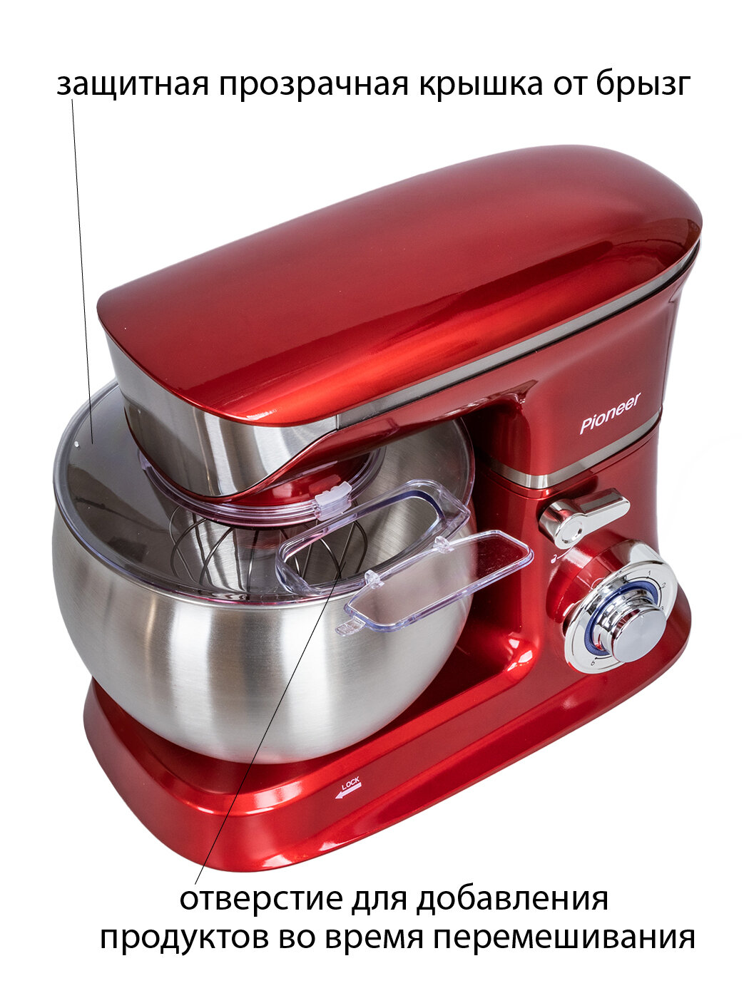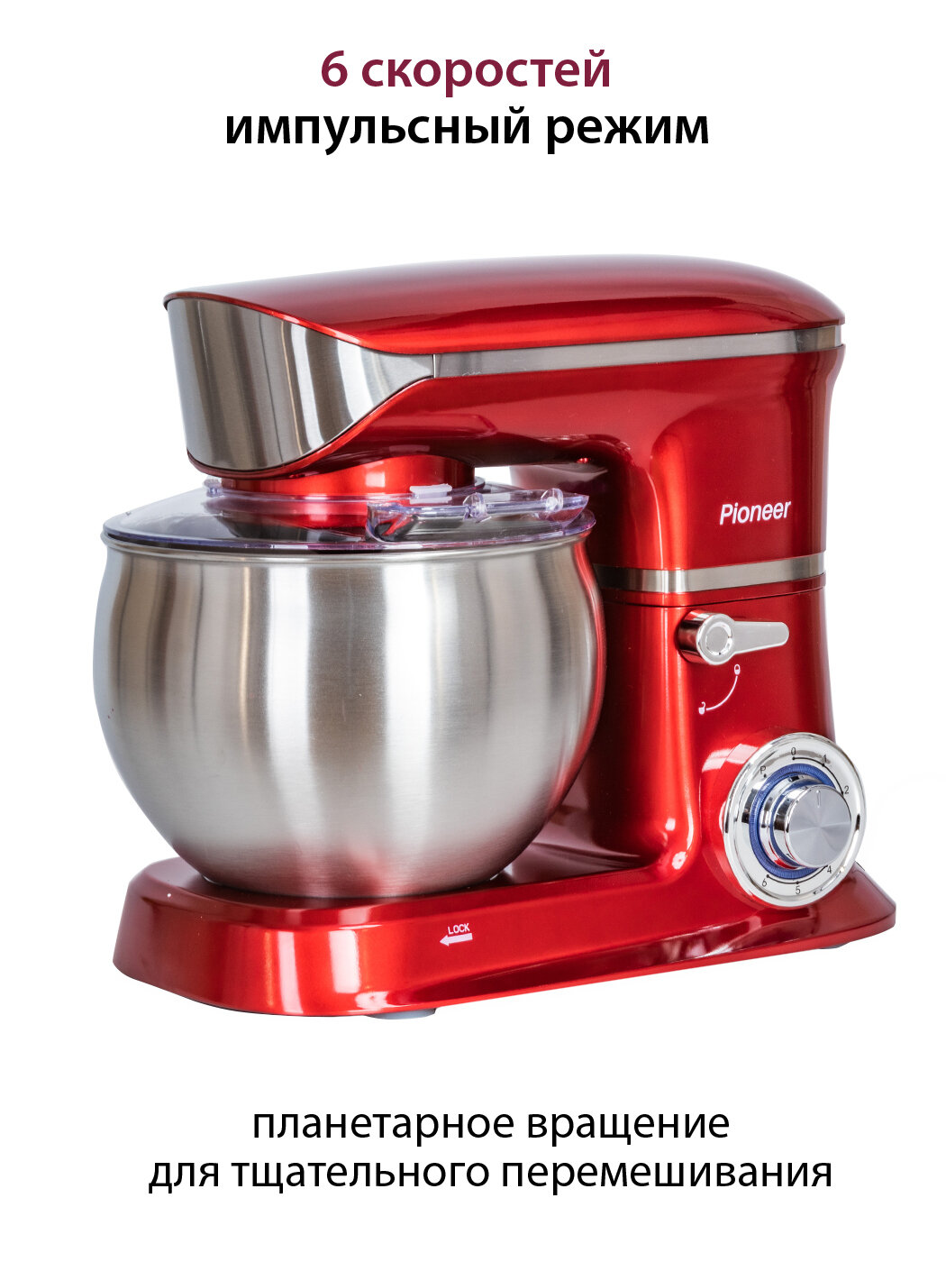 Миксер планетарный Pioneer MX327 red с чашей из нержавеющей стали 6 л, 6 скоростей, 3 насадки, импульсный режим, защита двигателя от перегрева, 1200 Вт