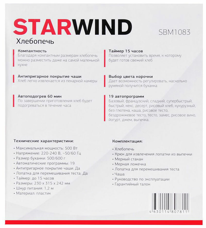 Хлебопечка Starwind SBM1083 500Вт черный интересное: