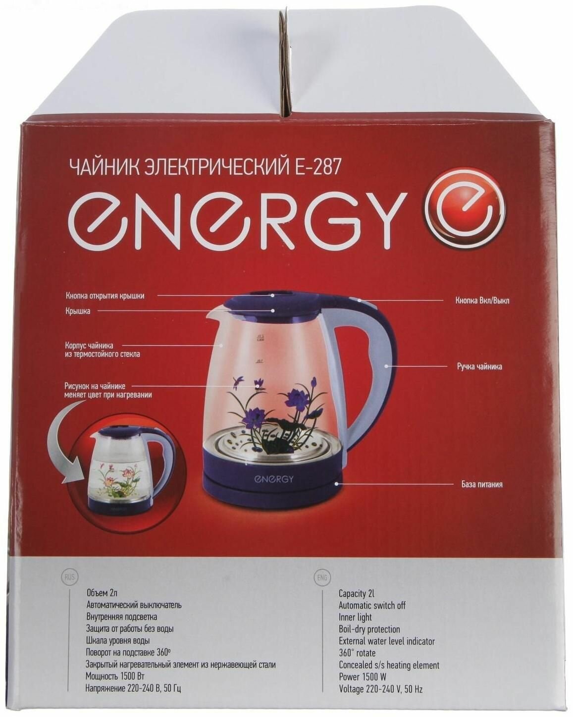 Чайник электр. Energy E-287 (диск 2л) 1,5кВт, стекло/пластик, меняется рисунок при нагревании 164119