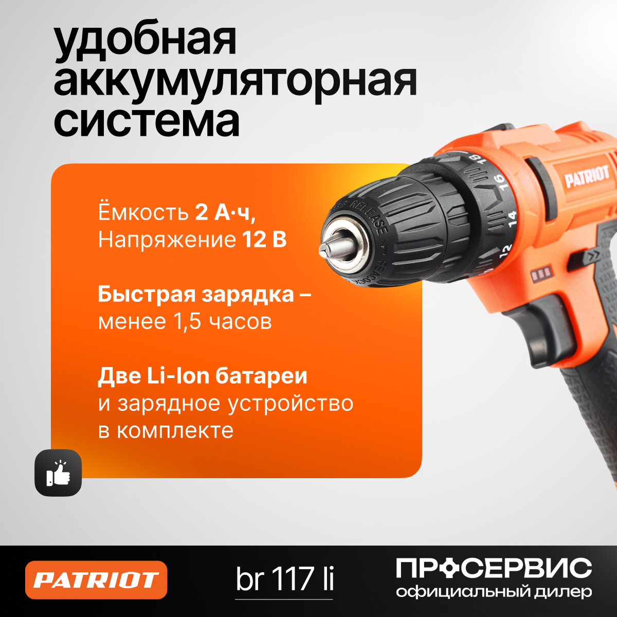 Дрель-шуруповерт аккумуляторная PATRIOT BR 117Li, две батареи Li-Ion 12В 2.0 Ач, арт. 180301117