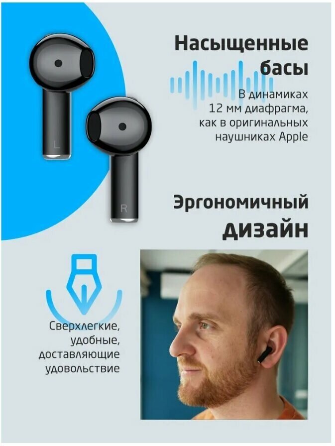 | Плюсы: | Отличные наушники, хороший звук, легко подключить без сторонних приложений, в ушах сидят удобно, долго держат заряд. Похожи на ЭирПодс. |