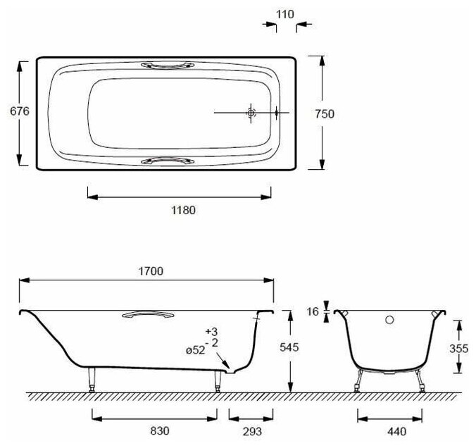 Чугунная ванна Jacob Delafon Diapason 170x75 E2926-00 с отверстиями для ручек