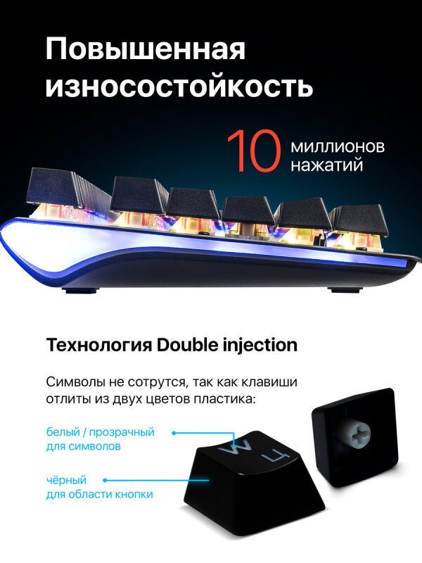 | Дополнительная информация | ; радужная подсветка, 9 режимов, 3-уровневая регулируемая яркость, возможность выключения подсветки; повышенная износостойкость; аппаратная блокировка клавиши WIN во время игры, распознает одновременное нажатие 26 клавиш, комбинации клавиш ""Fn+Ins"", горячие клавиши для быстрого доступа к офисным, мультимедийным и интернет приложениям; звонкий звук/щелчок переключателей; технология Double injection |