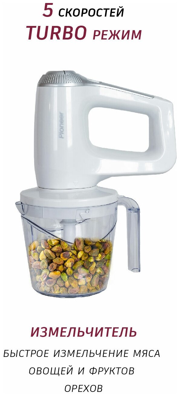 Блендер Pioneer 4 в 1, мощность 500 Вт, насадка- из нержавеющей стали, венчики для взбивания из нержавеющей стали, крючки для замеса теста из нержавеющей стали, измельчитель с ручкой объемом 1 литр, белый