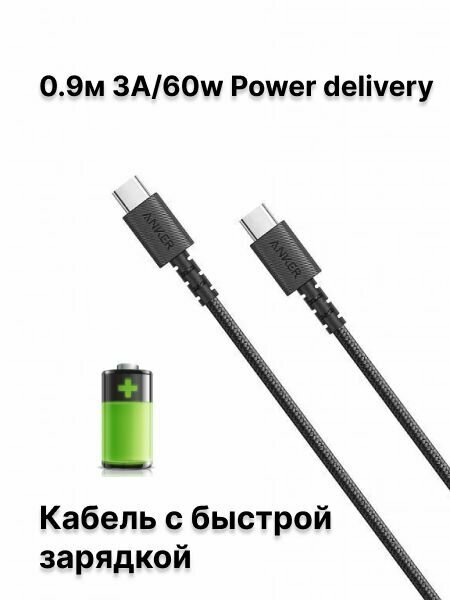 Data-кабели ANKER Кабель Anker A8032, Type-C - Type-C, 3 А, 60 Вт, 0.9 м, зарядка + передача данных, черный
