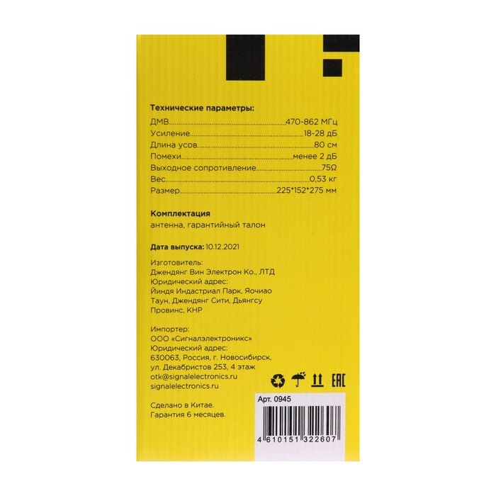 | Особенности | активная антенна, прием DVB-T/DVB-T2, регулировка мощности усиления |