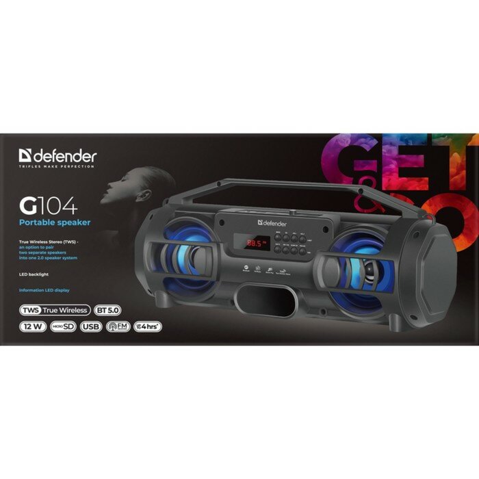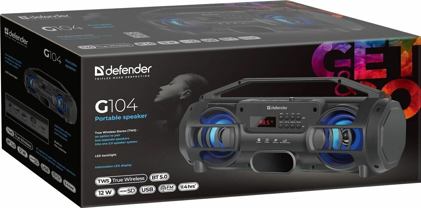 Колонка портативная Defender G104 bluetooth 5.0 аудиосистема - 12 Вт, FM, плеер, подстветка, дисплей,TWS. черная