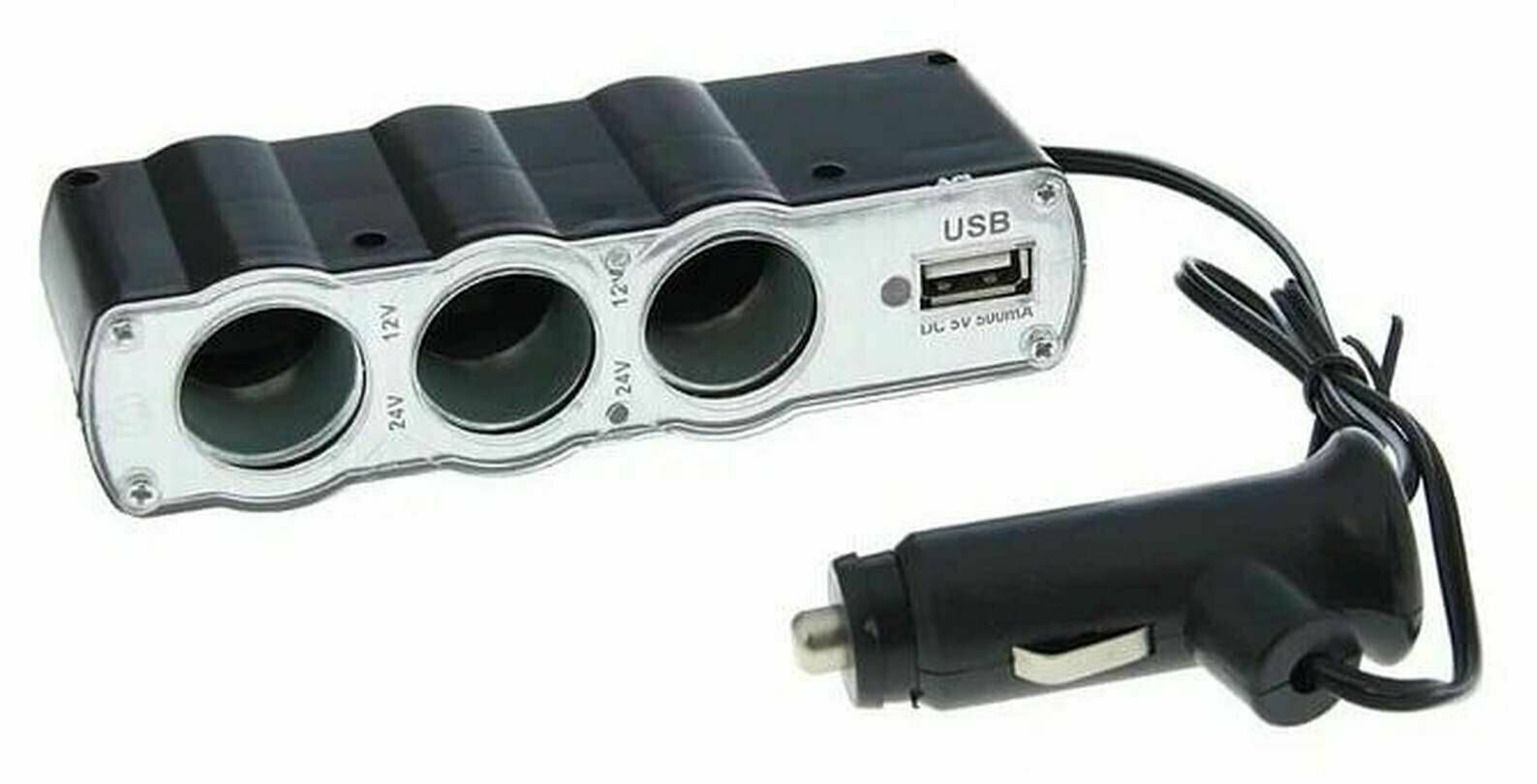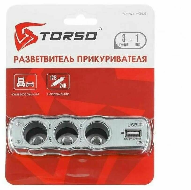 Разветвитель прикуривателя TORSO, 3 гнезда + USB, 12/24 В./В упаковке шт: 1