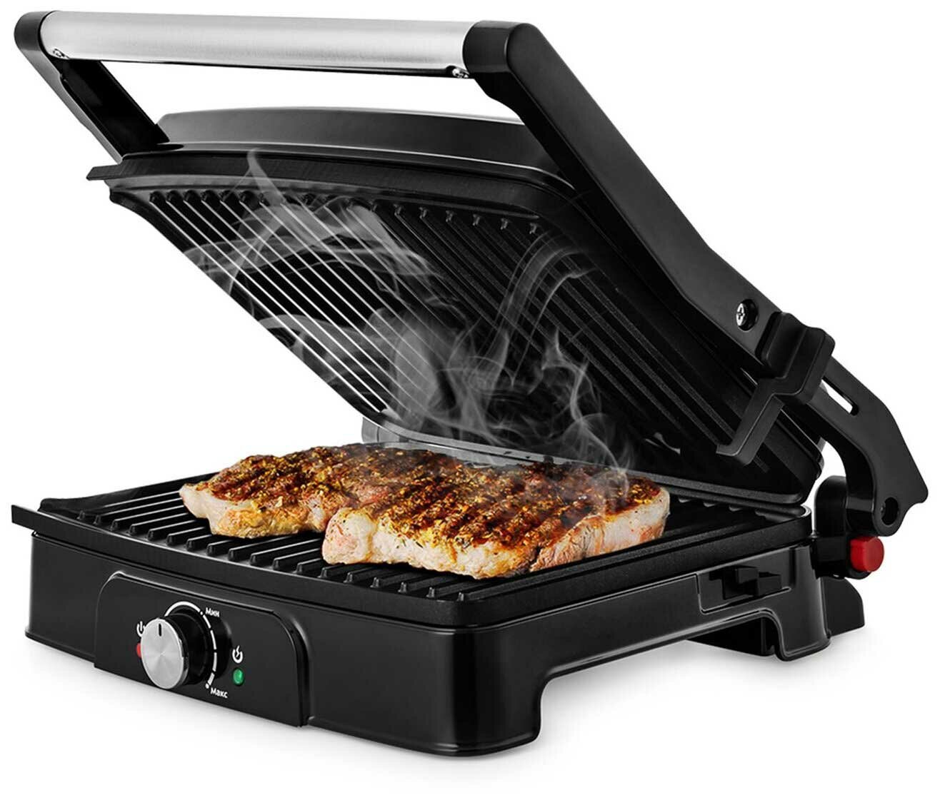 | Плюсы: | Быстрый нагрев, оптимальный размер панелей, простое управление, прекрасная прожарка мяса и овощей, раскладывающиеся на 180 градусов панели |