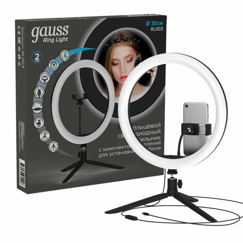 Кольцевая светодиодная лампа Gauss с комплектом креплений для установки телефона. 30 см.