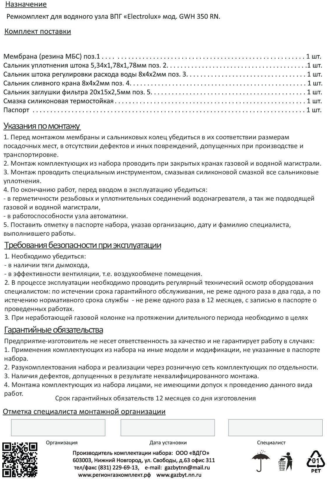 Ремкомплект газовой колонки Electrolux GWH 350 RN (мембрана и сальники)