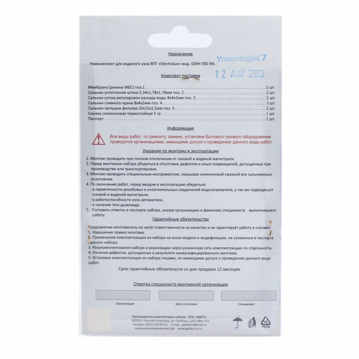 Ремкомплект газовой колонки (водонагревателя) ELECTROLUX мод. GWH 350 RN (в блистере) 1020225 интересное: