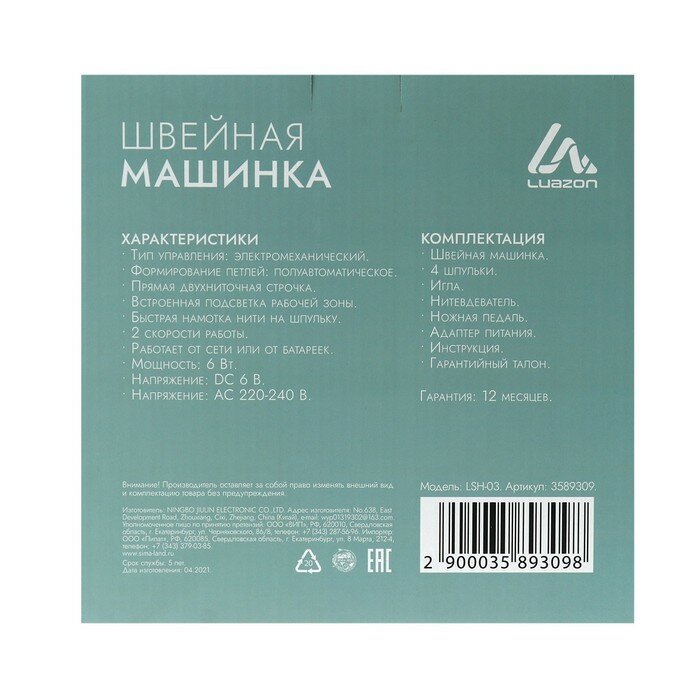 Швейная машинка LuazON LSH-03, 6 Вт, полуавтомат, 2 скорости, 4xАА или 220 В, белая./В упаковке шт: 1 интересное: