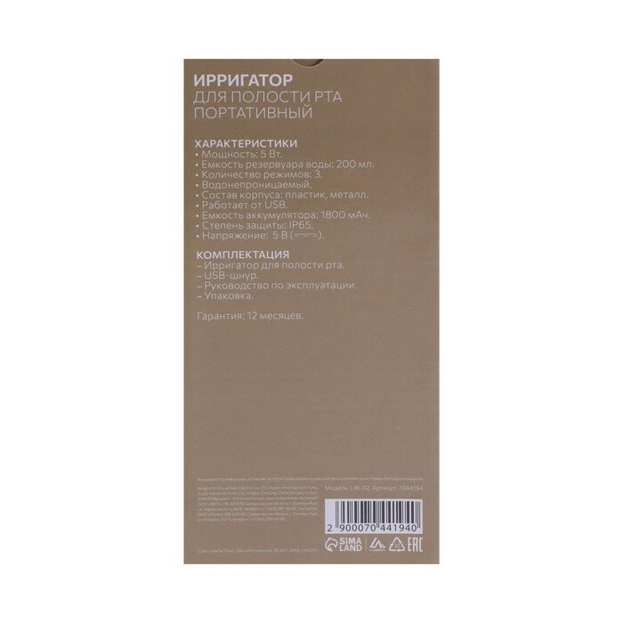 Ирригатор для полости рта LuazON LIR-02, портативный, 200 мл, 3 режима, 1 насадка, от USB./В упаковке шт: 1 интересное: