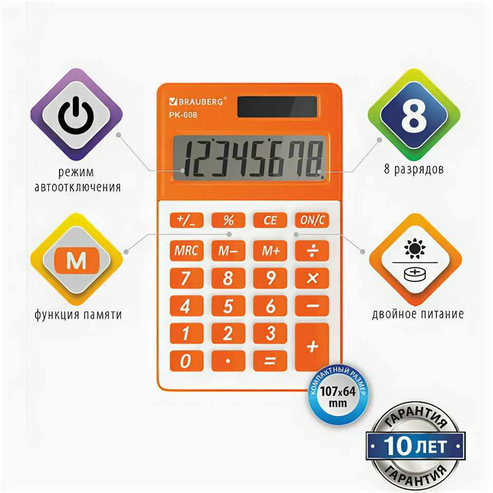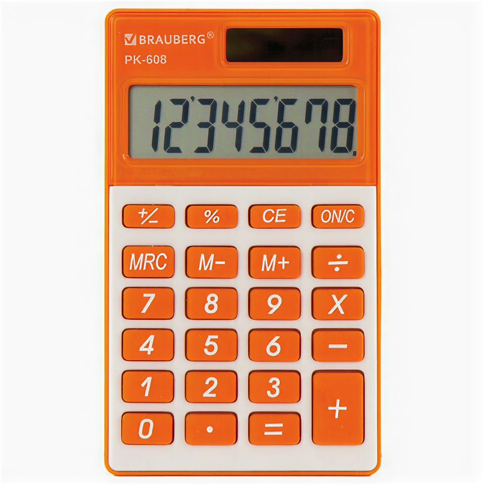 Калькулятор карманный BRAUBERG PK-608-RG (107x64 мм), 8 разрядов, двойное питание, оранжевый, 250522 В комплекте: 1шт.