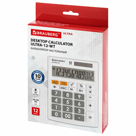 Калькулятор настольный BRAUBERG ULTRA-12-WT (192x143 мм), 12 разрядов, двойное питание, белый, 250496 В комплекте: 1шт.