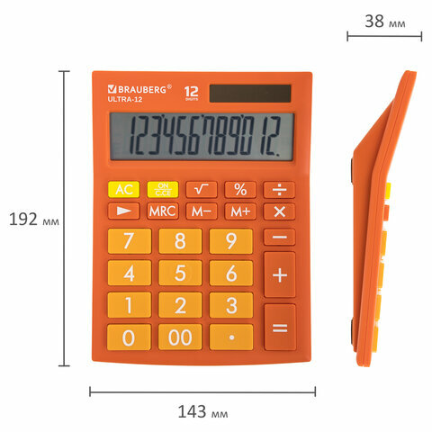 Калькулятор настольный BRAUBERG ULTRA-12-RG (192x143 мм), 12 разрядов, двойное питание, оранжевый, 250495