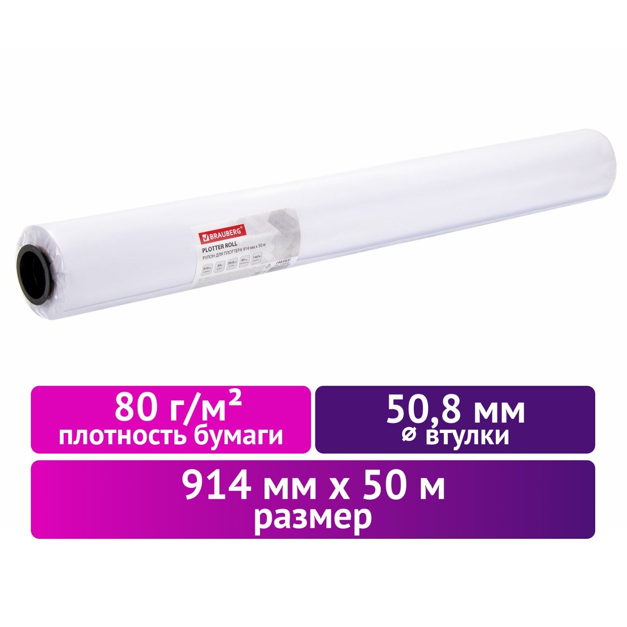 Рулон для плоттера и инженерных машин BRAUBERG, А0+, 914 мм х 50 м х втулка 50 мм х диаметр 100 мм, 80 г/м2, CIE 146%