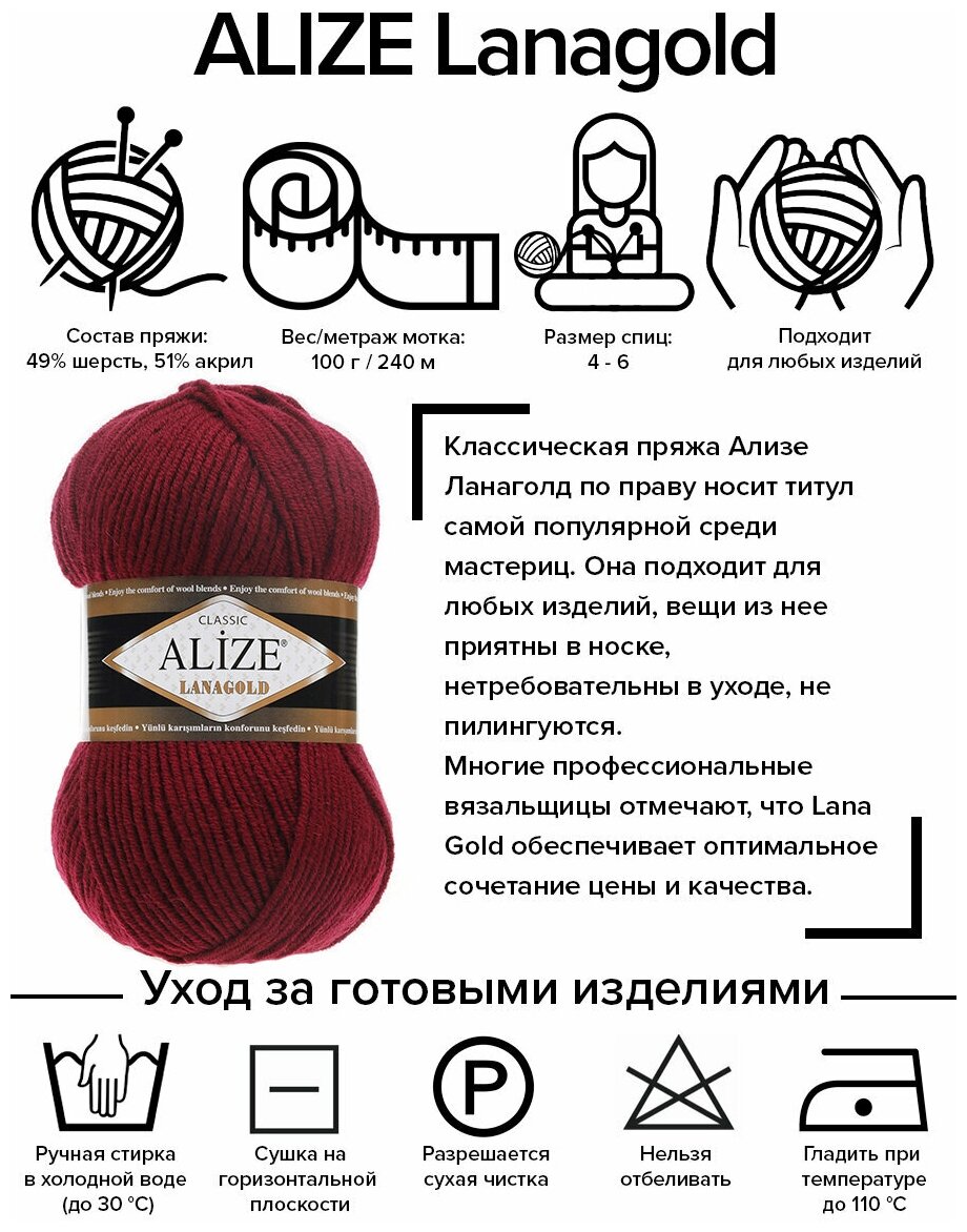 СохранитьALIZE Пряжа "Lanagold" 51% акрил, 49% шерсть 240м/100гр (57 бордовый) интересное:
