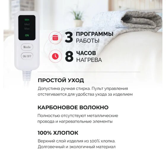 | Плюсы: | Работает идеально. Мягкое тепло. Отдельная регулировка. В осенний сезон - то, что нужно, для комфортного сна. |