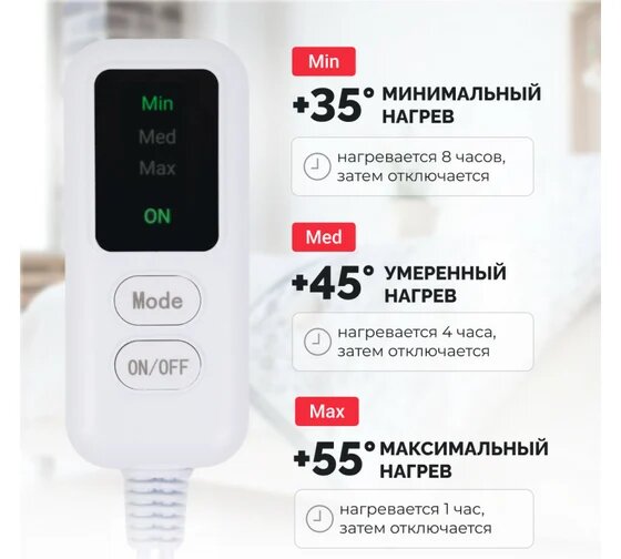 | Плюсы: | Отличное одеяло. Имеет таймер, что важно для безопасности, т. К. Был негативный опыт использования старого - чуть не сгорели, поэтому пусть отключается через час как здесь. |