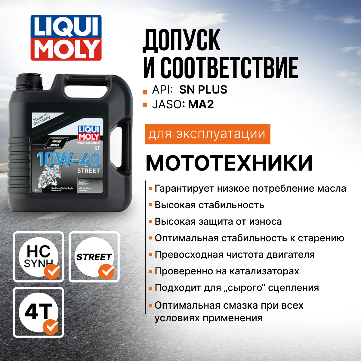 Масло LIQUI MOLY 4T Motorbike Street 10W40 SN plus, MA2 (4л) синт. для 4-тактных мотоциклов