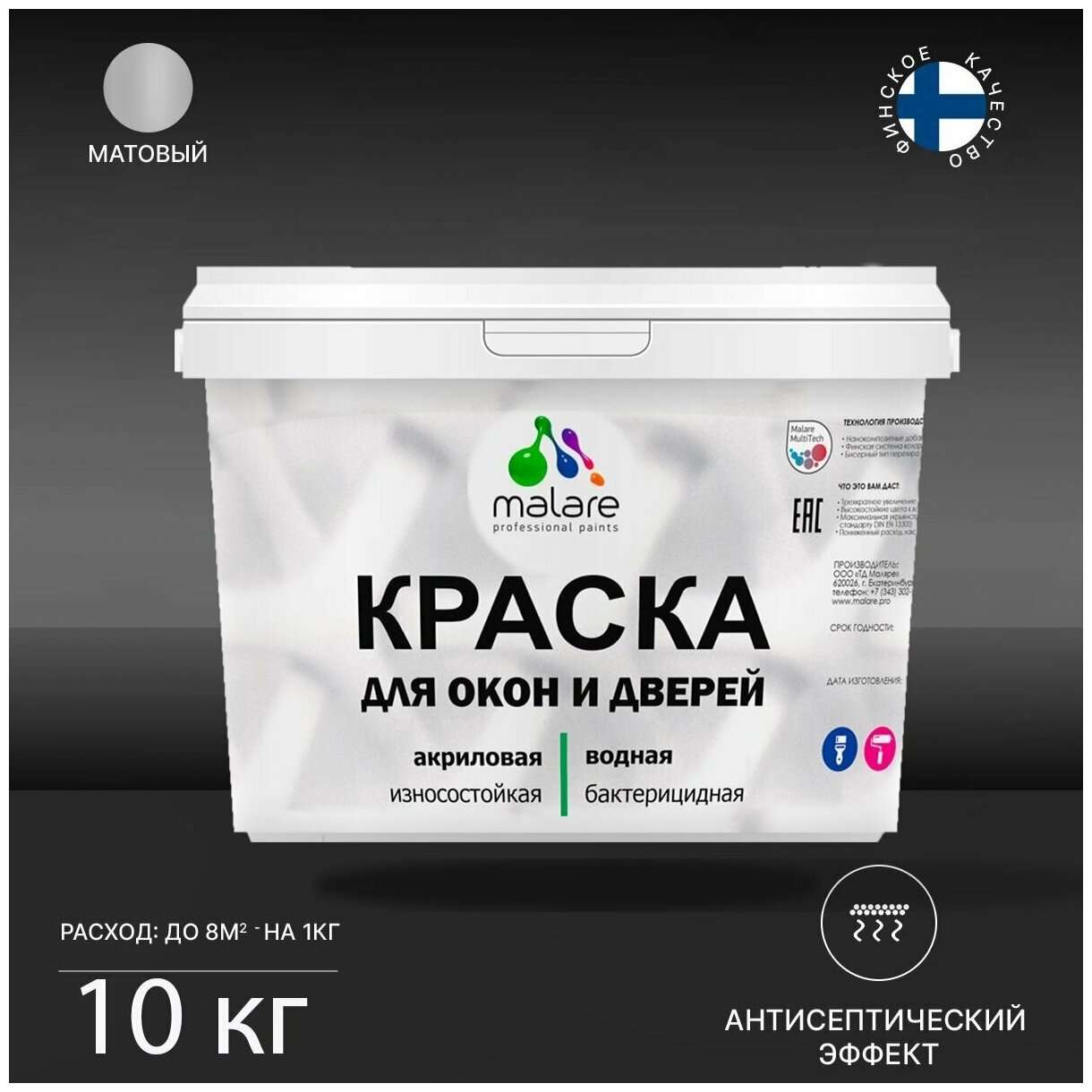 Краска Malare для окон и дверей, оконных рам и межкомнатных дверей, по дереву, для любых деревянных поверхностей, с антисептическим эффектом, матовая, белый, 2 кг.