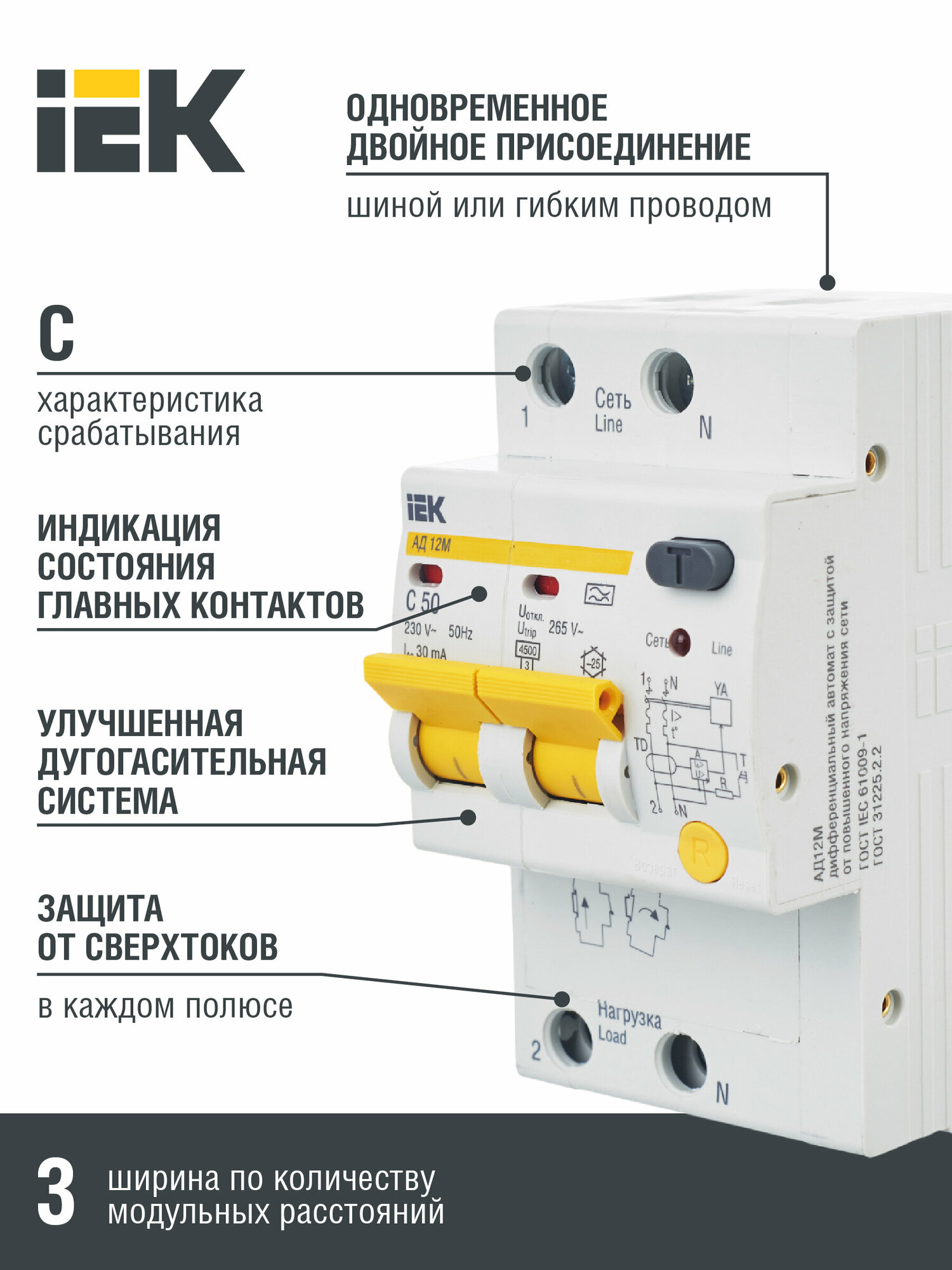 Автоматический дифференциальный выключатель тока IEK 2п 3мод. C 16A 30mA тип A 4.5kA АД-12М ИЭК MAD12-2-016-C-030