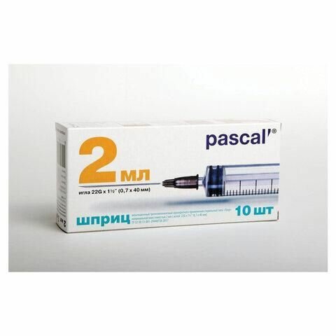 Шприц 3-х компонентный PASCAL, 2 мл, комплект 10 шт. в коробке, игла 0,7х40 - 22G, ш/, 120207 630505