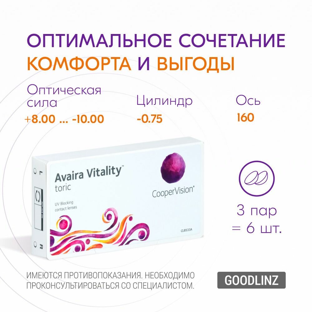 Контактные линзы Avaira Vitality toric R 8.5, D +2.5, CYL -0.75, AX 160, DIA 14.5, 6 линз
