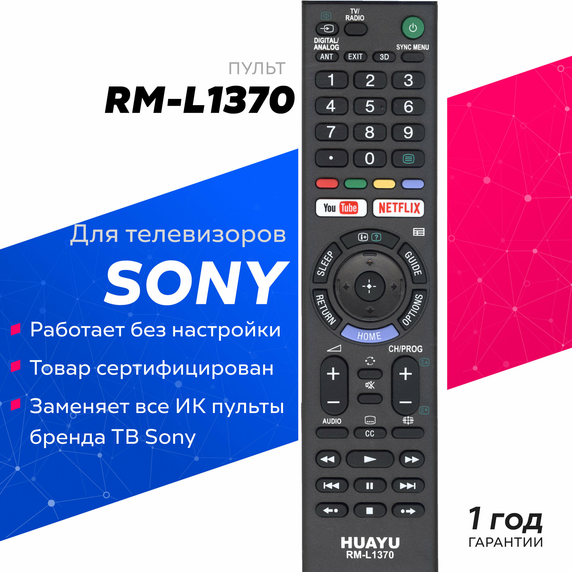 Пульт универсальный Huayu Sony RM-L1370 с кнопками NETFLIX / You Tube