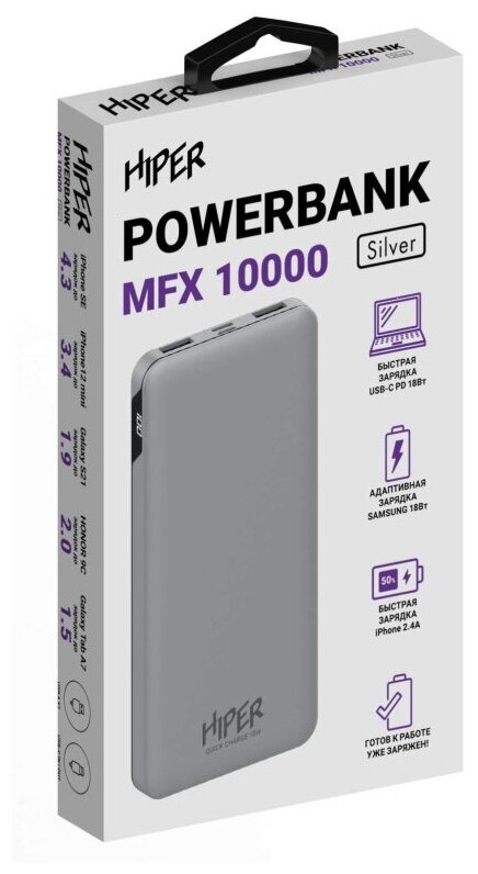 Внешний аккумулятор (Power Bank) HIPER MFX 10000, 10000мAч, серебристый [mfx 10000 silver]