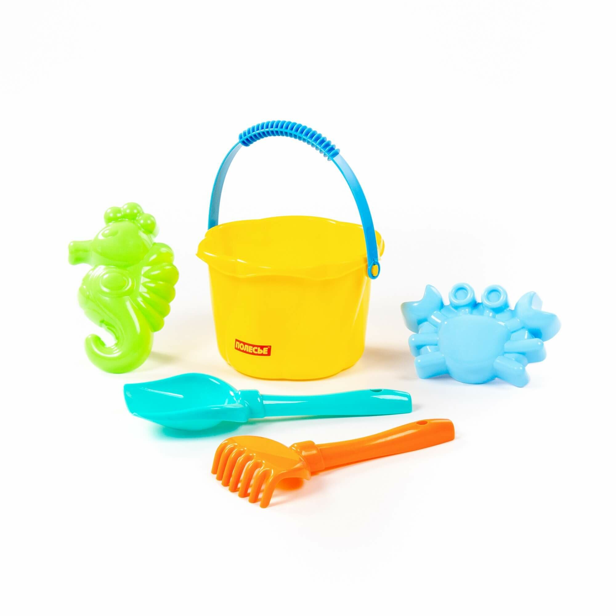Полесье Набор №664 для песочницы: ведро-цветок среднее №4, лопатка №5, грабельки №5, формочки (краб №1 + морской конёк) интересное: