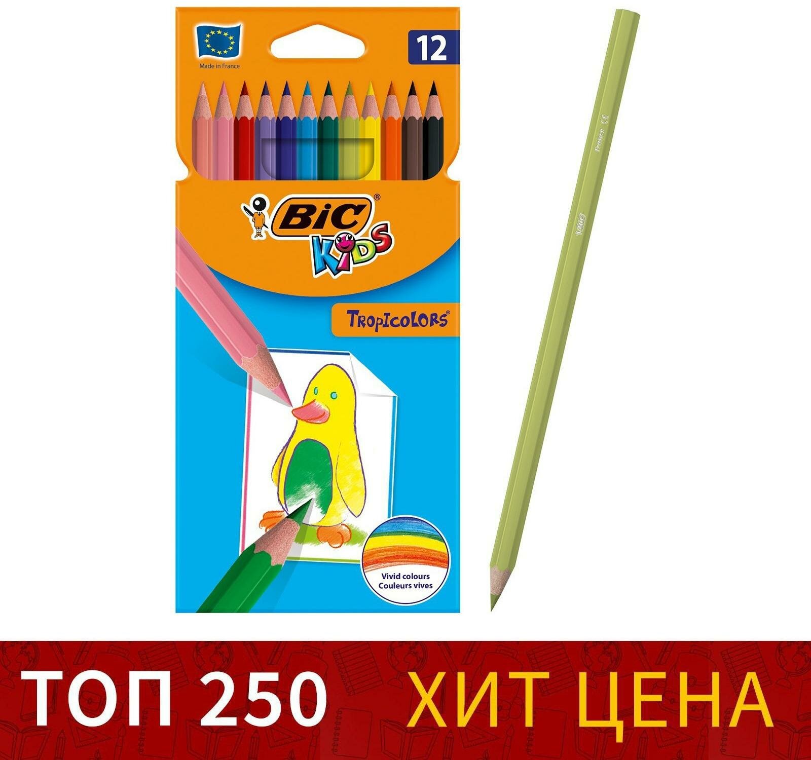Карандаши 12 цветов BIC Kids Tropicolors, детские, шестигранные, ударопрочные. В наборе 1шт.