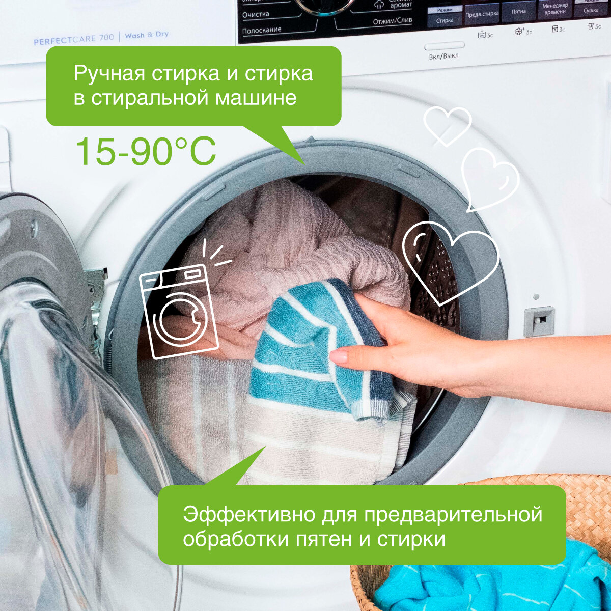 | Состав | подготовленная вода > 30% / Н-тензиды (ПАВ из растительного масла): этоксилированный жирный спирт из пальмоядрового масла / этоксилированный терпен / алкилполигликозид 5–15%; А-тензиды (ПАВ из растительного масла): метилэфир сульфонат натрия / лауретсульфат натрия 5–15%; глицерин 5–15%; зелёные хелаты (МГДА / ГЛДА) < 5%; антиресорбенты — карбоксиметилинулин < 5%; ингибитор переноса красителей — винилпирролидон < 5%; энзимы без ГМО (смесь протеазы / амилазы / целлюлазы / липазы / маннаназы) < 5%; морская соль < 5%; загуститель — гидроксиэтилцеллюлоза < 5%; функциональная добавка — растительный полимер < 5%; консервант — бензоат натрия < 5% |
