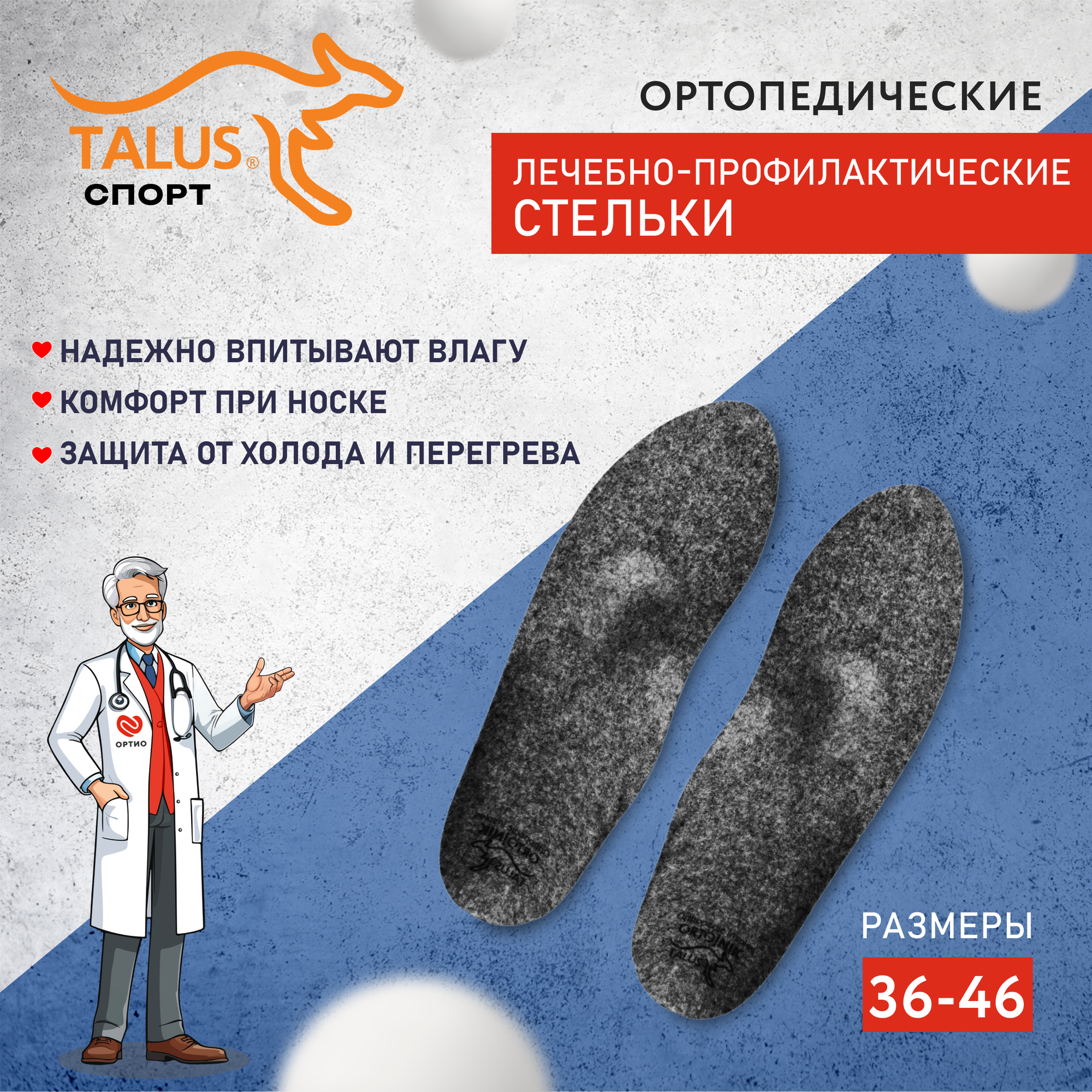 Стельки ортопедические Talus "Зима" каркасные, войлок, размер 46