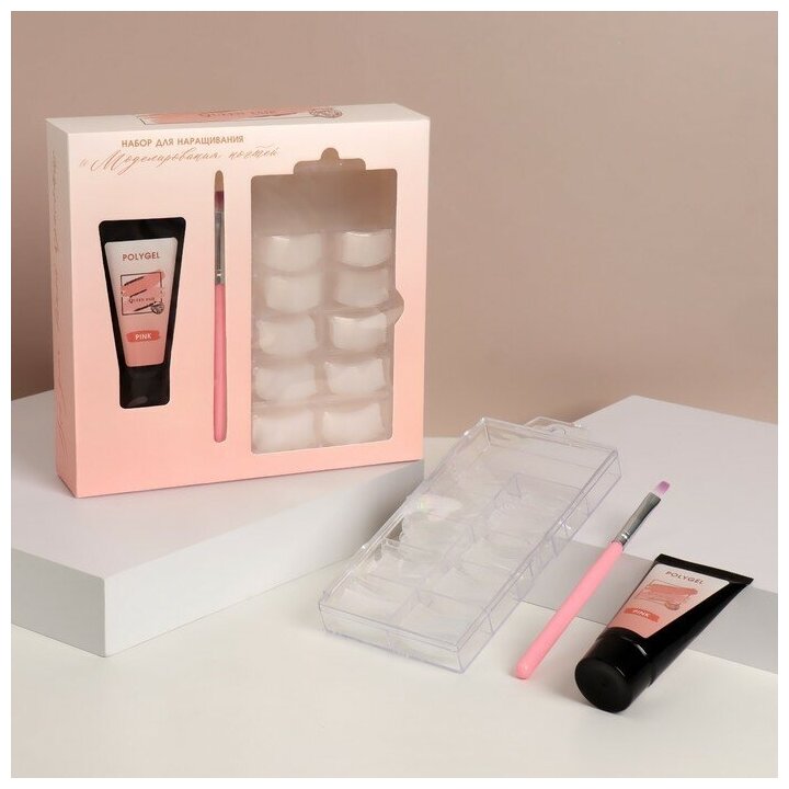 Набор для наращивания ногтей: нижние формы, розовая акриловая пудра, гель, в картонной коробке