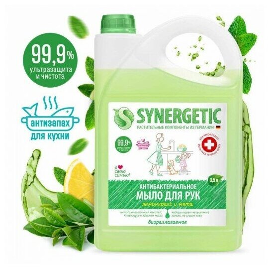 Мыло жидкое антибактериальное 3 5 л SYNERGETIC "Лемонграсс и мята" антизапах, 1 шт