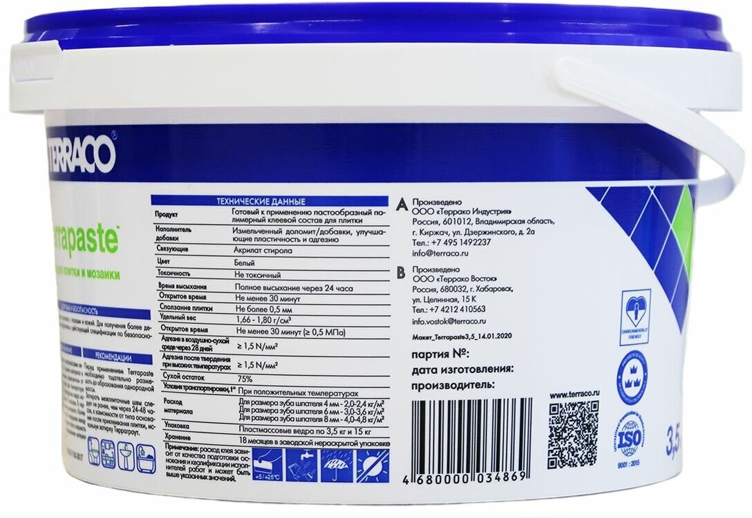 TERRACO TERRAPASTE клей для плитки пастообразный, на акриловой основе (3,5кг)