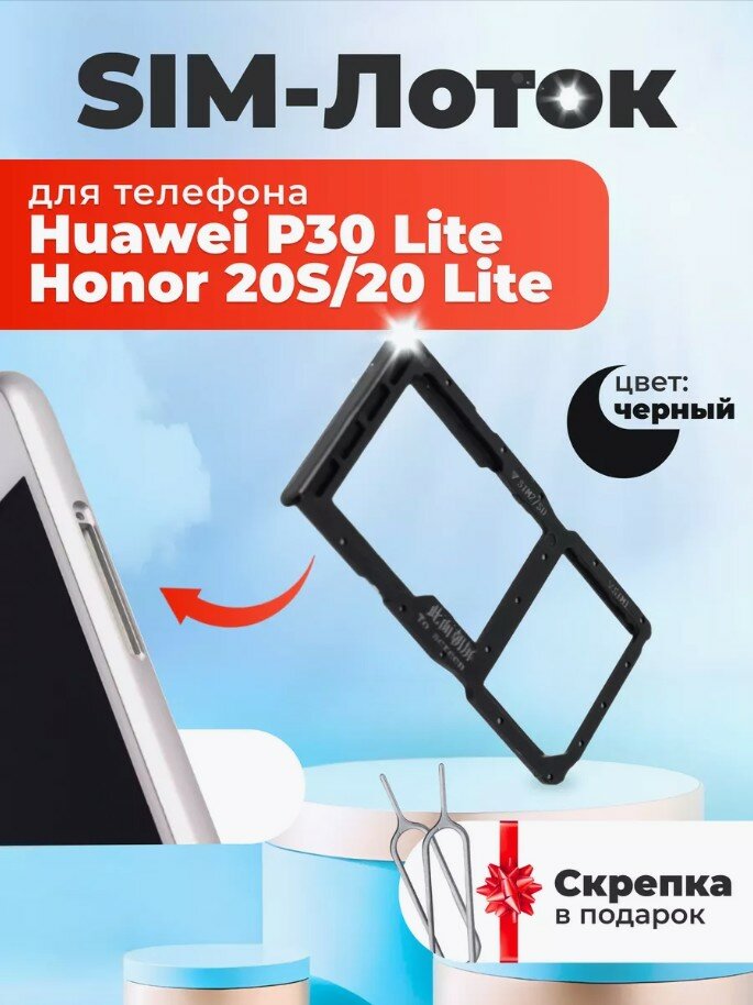 Держатель сим карты лоток Контейнер SIM Huawei Honor P30 Lite/Honor 20 Lite/Honor 20S черный / скрепка в подарок