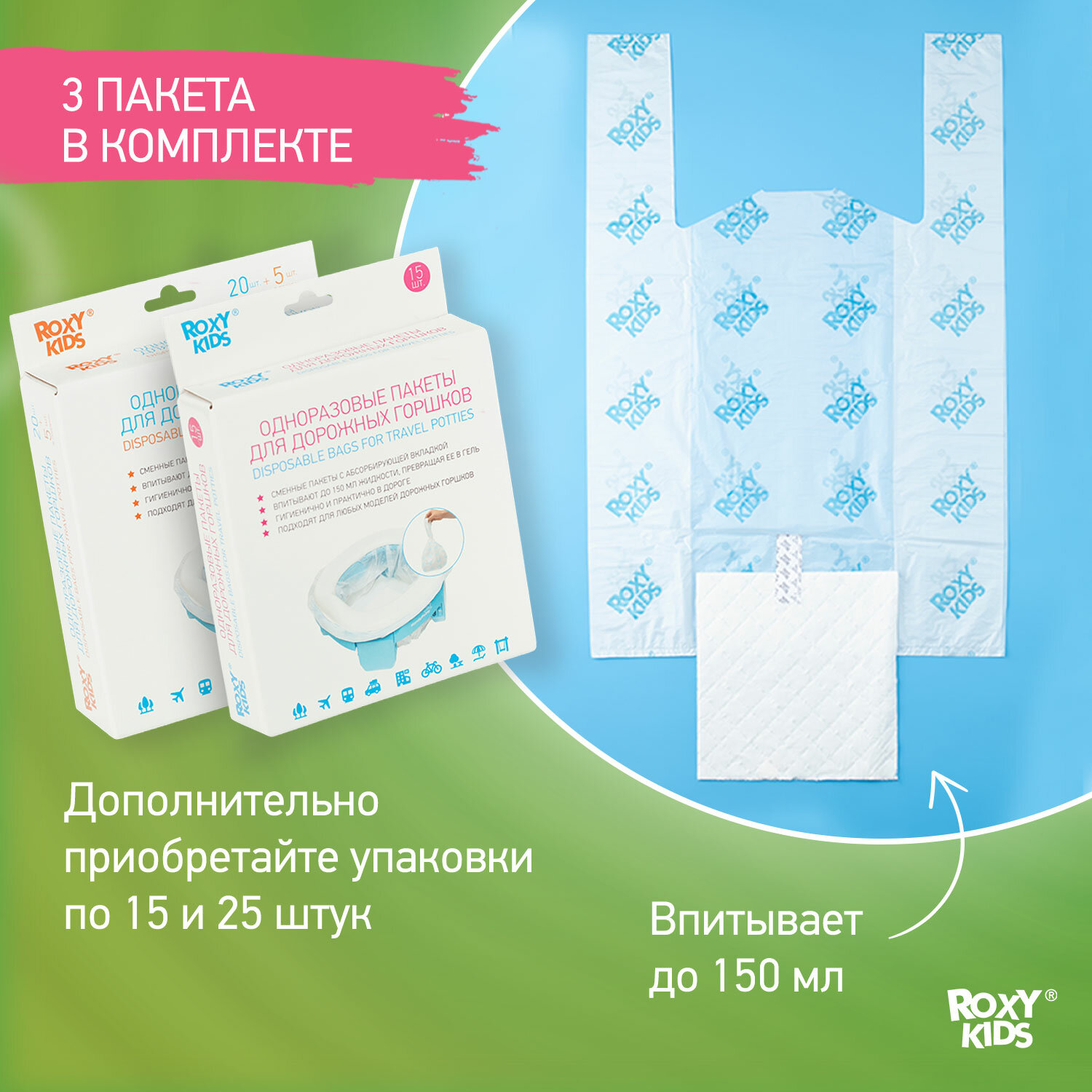Компактно складывается в сумку в комплекте, в тч вместе со вставкой (она складывается гармошкой). Дополнительно покупали пакеты, использовали пару раз -тоже удобно, внутри впитывающий слой, не нужно ничего выливать. |