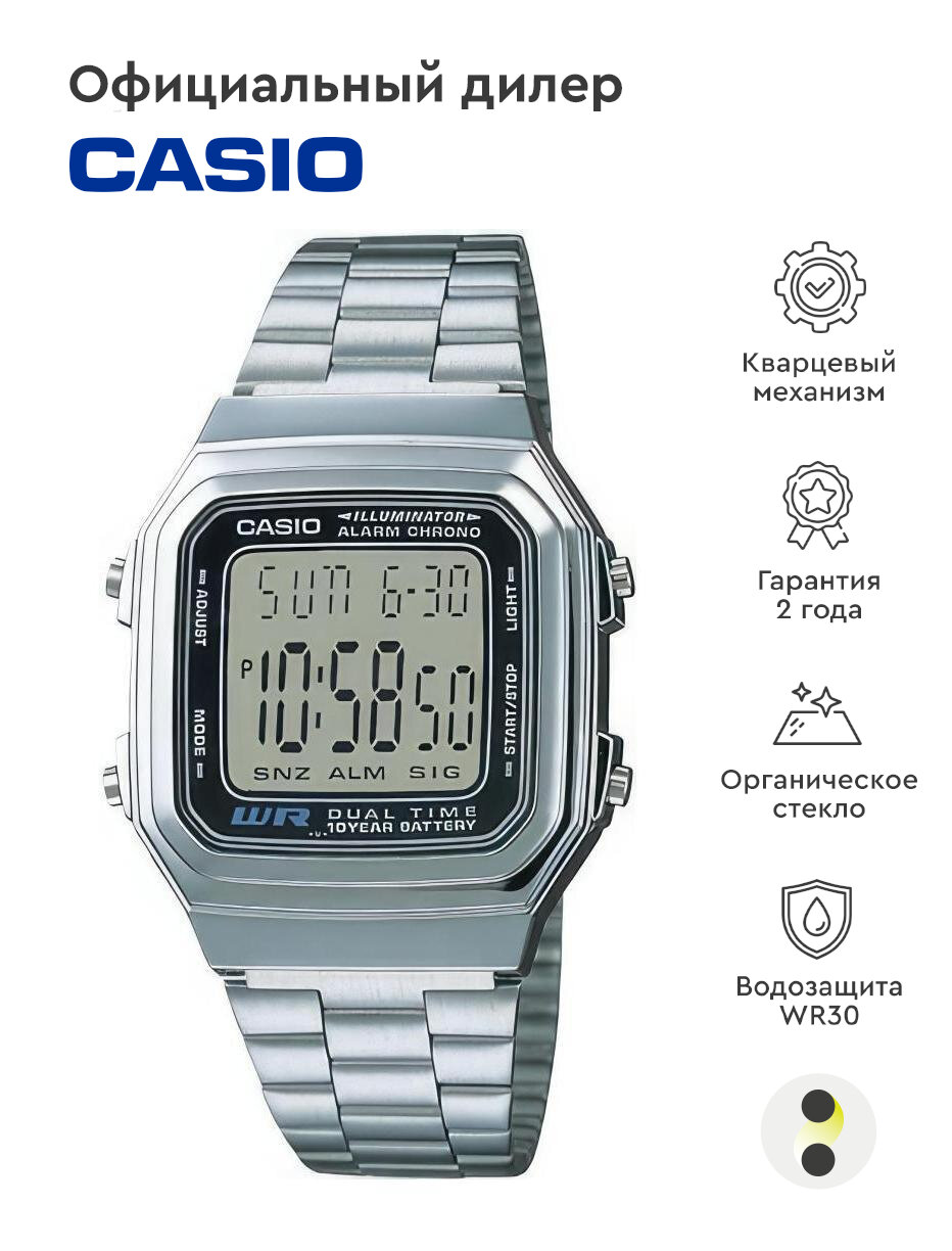 Наручные часы CASIO A-178WA-1 кварцевые, будильник, секундомер, водонепроницаемые, бесшумный механизм, подсветка дисплея, серебряный