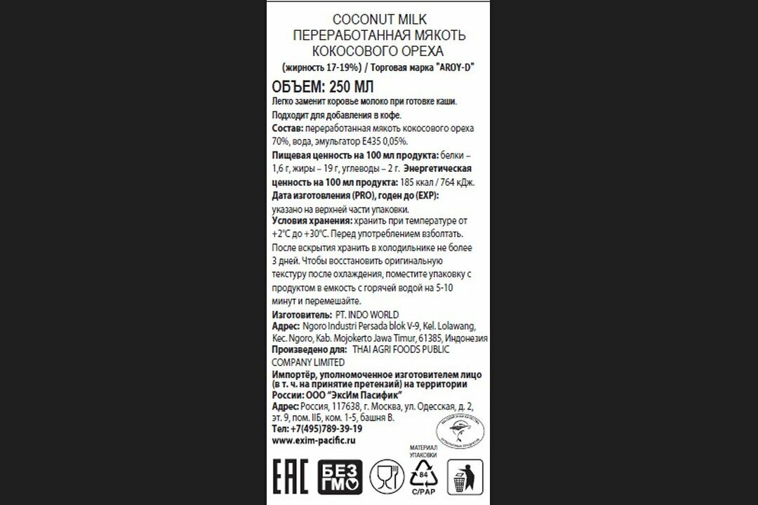 | Состав | переработанная мякоть кокосового ореха 70%, вода 29,99%, эмульгатор E 435 = 0,01% |