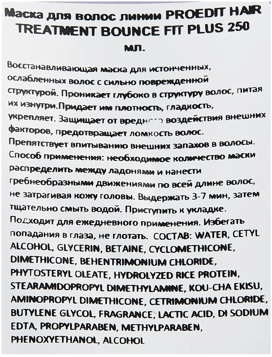 | Способ применения | разогреть в ладонях Маску Proedit Bounce Fit+ 5-10 мл для волос средней длины и 10-15 мл для длинных волос и, начиная с кончиков, нанести на всю длину волос. Выдержать 5 минут. Обильно смыть водой |