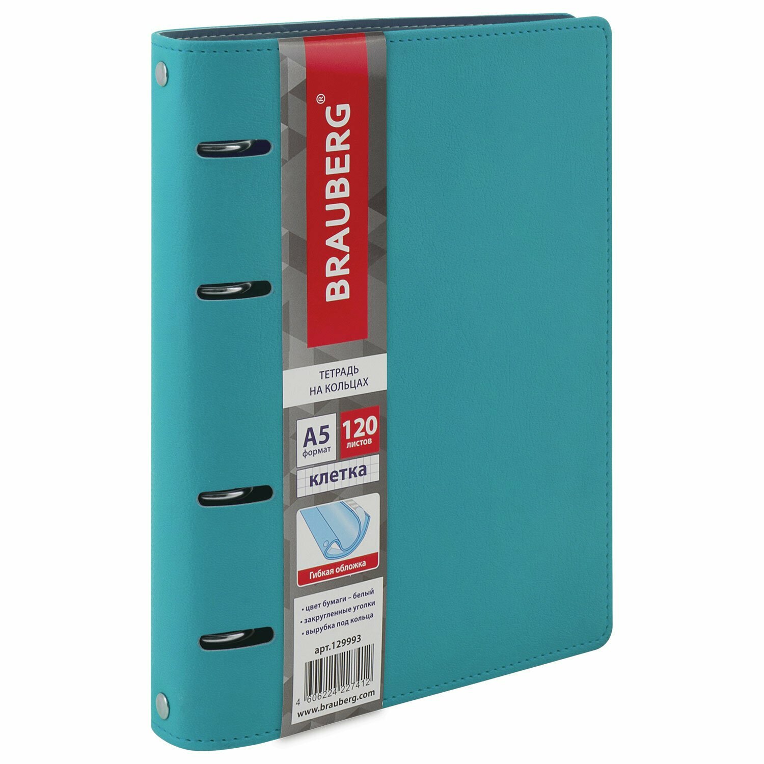 Тетрадь на кольцах А5 (180х220 мм), 120 листов, под кожу, клетка, BRAUBERG "Joy", бирюзовый/серо-голубой, 129993 (арт. 129993)