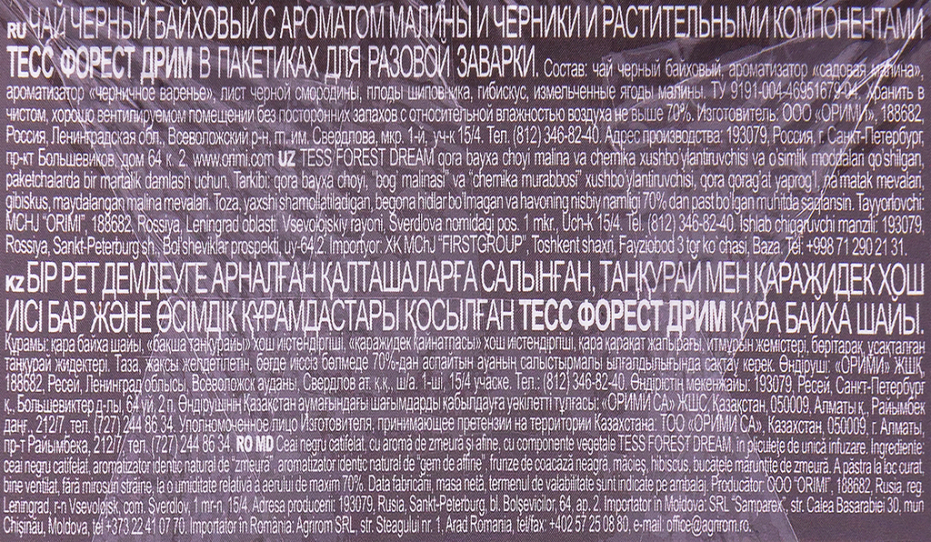 | Состав | чай черный байховый, лист черной смородины, плоды шиповника, гибискус, измельченные ягоды малины, ароматизатор садовая малина, ароматизатор черничное варенье |
