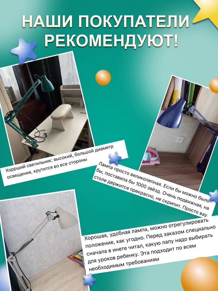 | Плюсы: | Качественное изделие красивого желтого (сама выбрала) цвета. Все собрано, только лампочку вкрутить и к столу прикрепить. Полностью соответствует моим запросам и радует глаз. Спасибо |