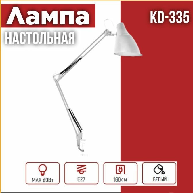 Настольный светильник Camelion KD-335 C01 белый, струбцина из высокопрочного пластика, 230V, 40W, E27 13876