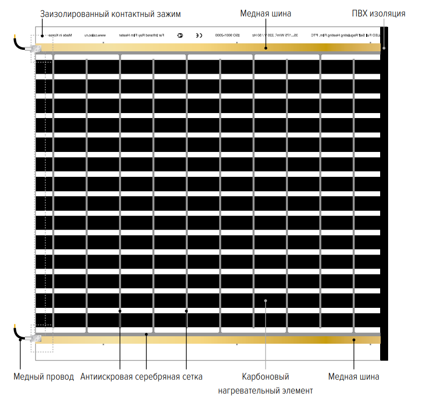 | Дополнительная информация | полная саморегуляция; длина волны ИК обогрева - 5-20 мкм; класс защиты - IP57; прозрачность термопленки - прозрачная; шаг отреза: 5 см; антиискровая сетка |