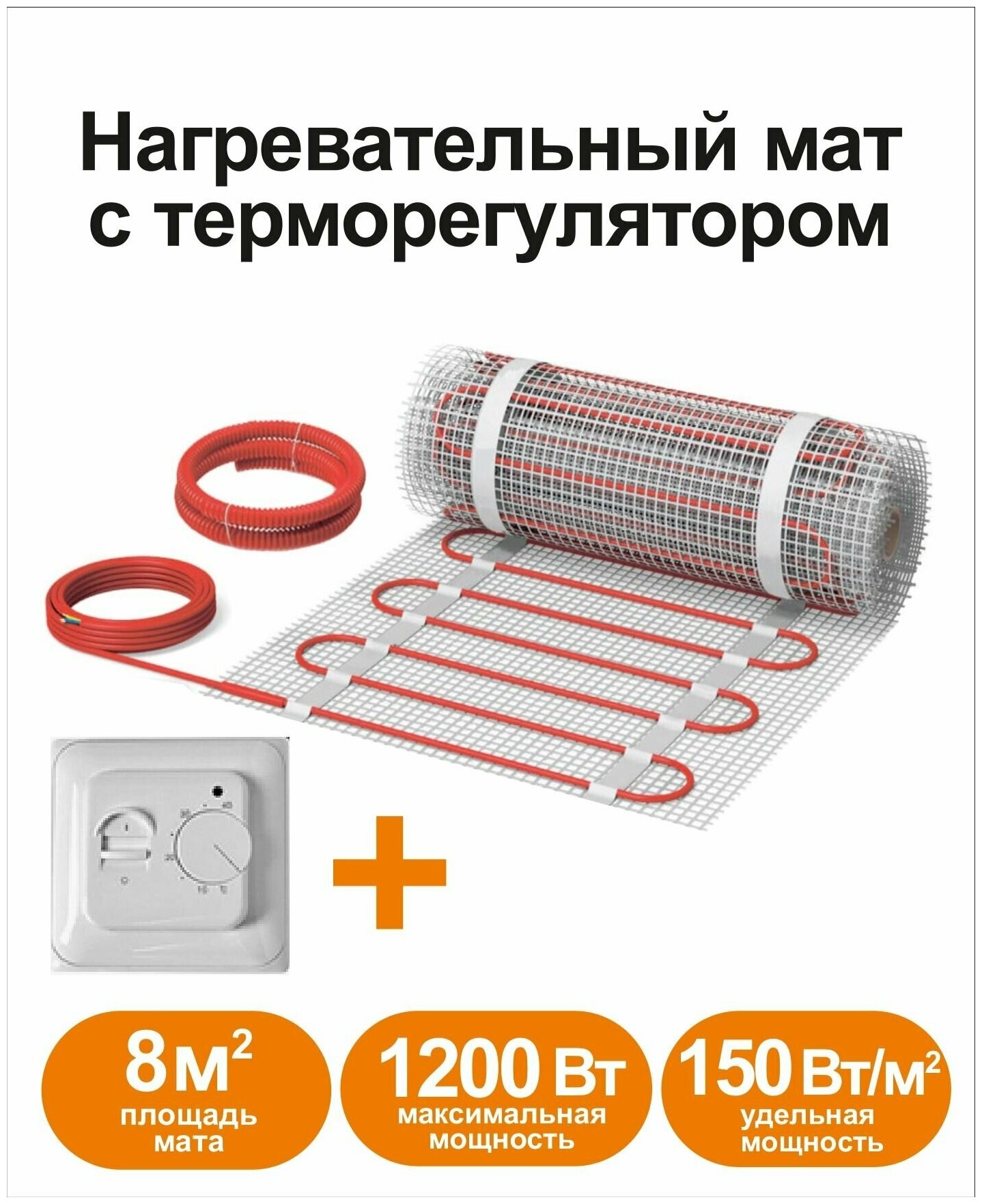 Теплый пол электрический мат под плитку КМ Light-1200 - 8.0 м2 с механическим терморегулятором